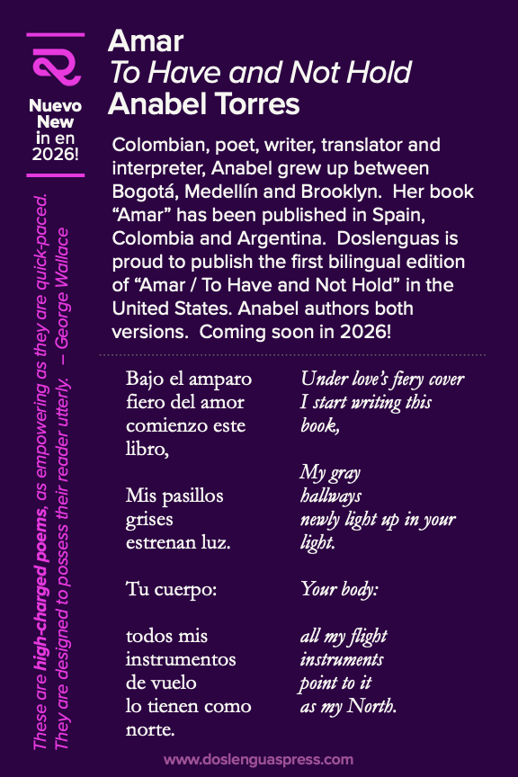Coming in the spring of 2026 is Anabel Torre’s "Amar to Have and Not Hold," published by Dos Lenguas Press.